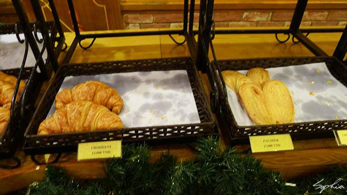 Pat' a Chou的法國麵包、可頌等麵包也挺有名的。我看了一會兒,選擇了不少旅人推薦的蝴蝶餅。蝴蝶餅一片17,000盾 (大約港幣6元),可頌的價錢也差不多,不會很貴。