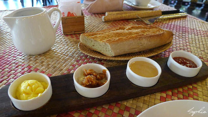 我點的是西式早餐。早餐的麵包是好大一塊法國麵包,搭配的沾醬有四種,奶油、蜂蜜、番茄醬,還有我不知道的醬料。