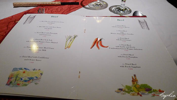 吳哥寶發酒店餐廳賣的是傳統高棉料理,餐點選擇挺多的,而餐點價格雖然比市集中的餐廳貴了一點,但是也不會過高,比如在市集中吃到的一份餐是4塊美金,這裡是7塊美金,算是能接受的範圍。研究了一下菜單,再加上考慮了旅遊書上的推薦菜色,我選擇了牛肉咖哩。「牛肉咖哩好吃的令人訝異。」這是書上的形容。就讓我嚐嚐牛肉咖哩,看我會不會訝異吧。