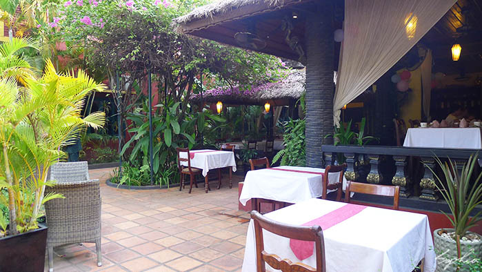 我所下榻的吳哥寶發酒店,其實全名叫做吳哥寶發酒店及餐廳 (Bopha Angkor Hotel & Restaurant)。吳哥寶發酒店的餐廳是個很有熱帶風情的茅草屋頂大亭子,亭子位在酒店的花園中靠近馬路的位置,圍牆還在正對餐廳的位置開了個門,讓路過的旅客可以看到這間餐廳,並進來用餐。