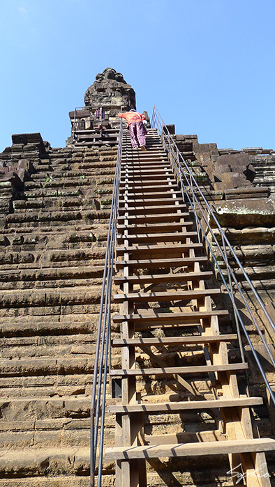 抬起頭,看著陡峭的階梯,我輕輕地嘆了一口氣。我早上在吳哥窟走了三小時,已經消耗不少體力,而巴芳寺沒有樹木遮蔽,完全暴露在陽光下,讓我光走到金字塔前就汗流浹背了,現在還得爬上十層樓的高度,才可以到最頂端? 好累喔。不過,已經來到這裡了,不上去實在說不過去,所以我便戴好帽子,斜背好包包,手抓緊樓梯欄杆,一步一步往上爬。