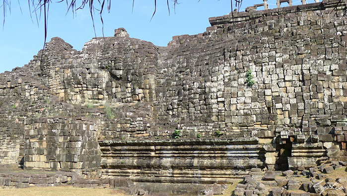 繞到巴芳寺的西面,我發現一層一層的金字塔形建築變得模糊不清,大石磚堆成的牆面還凹凹凸凸的,成為一個扭曲的牆面。是修復出了問題嗎? 我在心裡納悶著。