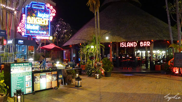 Noon Night Market 對面有另一個吳哥夜市 (Angkor Night Market),是新成立的夜市,裡頭有新裝璜好的餐廳、酒吧跟紀念品店,整體感覺很像美國常見到的郊區商場,而可能是因為感覺很不在地不夠傳統吧,所以裡頭冷冷清清的,只有幾個人在裡頭慵懶地走著。包含我。