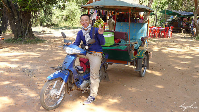 抵達暹粒之後,金林果然如同他的郵件給我的感覺一樣,親切又細心。到旅館接我,出發到吳哥遺跡公園之前,金林總會叮嚀我東西有沒有帶齊,外套有沒有圍巾有沒有,然後確認我坐好後,才踩著油門嘟嘟嘟的往前衝。每到一個景點,金林會簡介這個景點的由來,然後告訴我這個景點大概要花多少時間,約見面的地點。這個寺廟若有不同的出入口的話,他便會跟我約另一個出入口見面,讓我不用走重複的路徑,看到同樣的景點,且多走很多路。