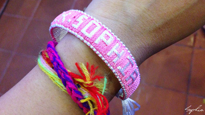 金林在這個晚上送我一個手環。粉紅色的手環,上面繡了我的英文名字SOPHIA。「哇。你自己做的嗎?」我驚訝地問。