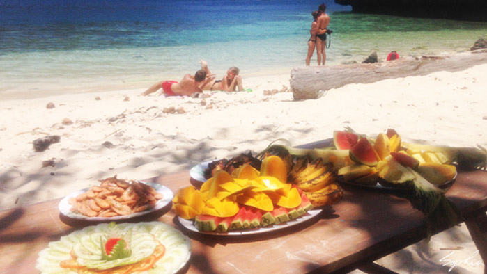 「沒問題沒問題。我小孩也不會游泳。套著救生衣就是了。而且,如果你真的不想游泳,留在船上也可以啊。」法蘭西斯說。這時候,他的電腦螢幕的臉書照片停在好多燒烤海鮮跟熱帶水果的畫面。這食物還蠻吸引人的。所以我可以為了這個「在沙灘上吃海鮮」的行程而參加吧。