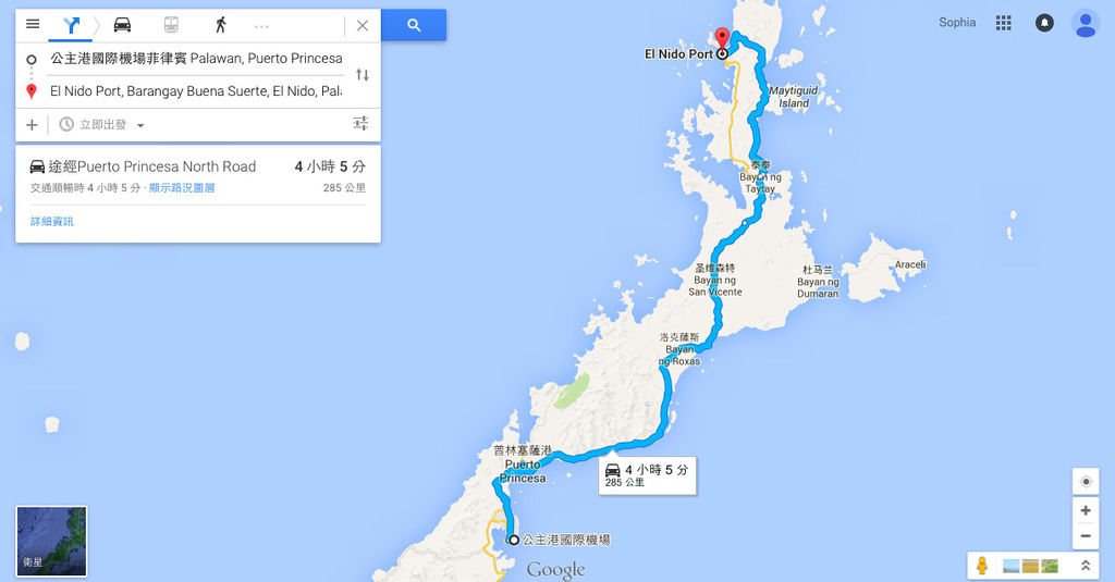 那麼,從普林塞薩港搭小巴到愛妮島要花多少時間呢? 若從普林塞薩港機場為出發點,愛妮島的港口為終點,距離為285公里,差不多是台北到台南的距離,車程約4-5小時 (加上中途的休息時間)。所以,想像一下開車南下或是北上的感覺,就知道自己有沒有辦法接受這個車行時間了。